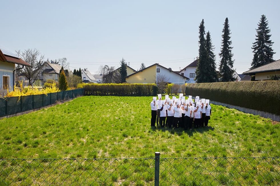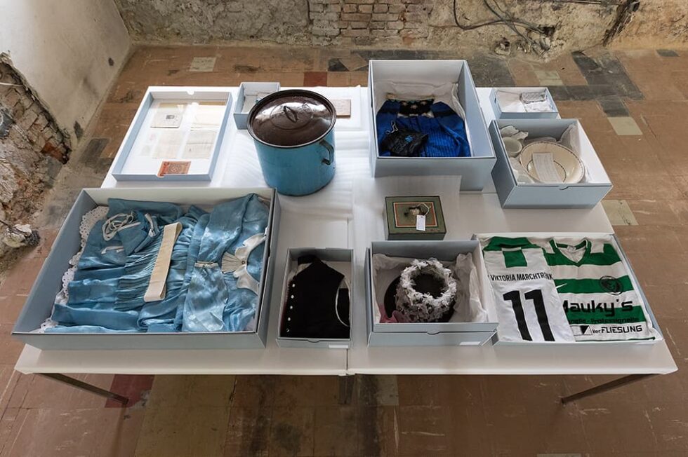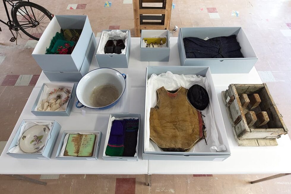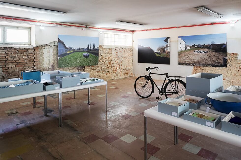 Photographies visualize situations referring to „moving in“. Together with original pieces and personal objects, which where used in building houses or remind their owners about their origin, they form tableauxs of the process of „claiming their land“. (Willi Dorner, März 2016)